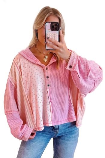 Long Sleeve Tops | Women Pink Floral Colorblock Striped Sleeve Waffle Patchwork Top
