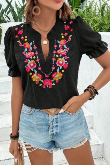 Blouses | Women Black Embroidered Floral V Neck Bubble Sleeve Blouse