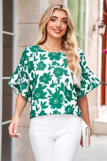 Blouses | Women Green Floral Print Ruffle Short Sleeve Loose Blouse