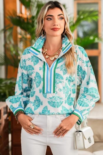 Blouses | Women Sky Blue Floral Print Striped Patchwork Collared Blouse