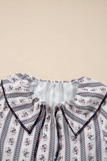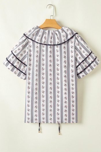 - Embrace Elegance With This White Ruffle V-Neck Floral Print Short Sleeve Blouse, Perfect For A Chic Boho Look.