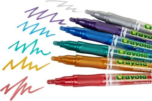- CRAYOLA COLORS: Features 6 shimmering shades: silver sparkle, Emerald zest, blue blazes, violet glitz, fire flecks, and gold medal.