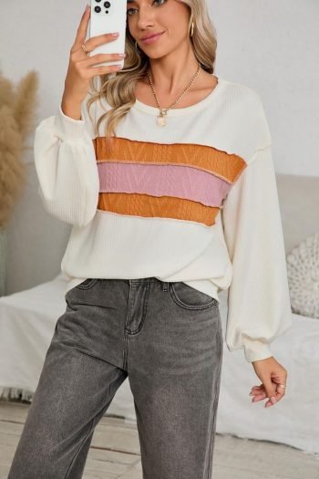 Long Sleeve Tops | Women White Corded Exposed Seam Patchwork Drop Sleeve Top