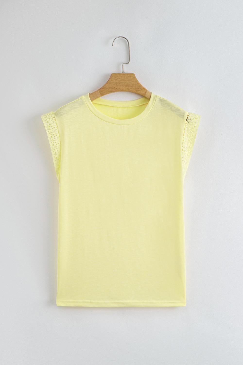 - Elevate Your Wardrobe With This Lace Patchwork Top, Featuring A Charming Cap Sleeve Design And A Classic Round Neck For A Touch Of Elegance.