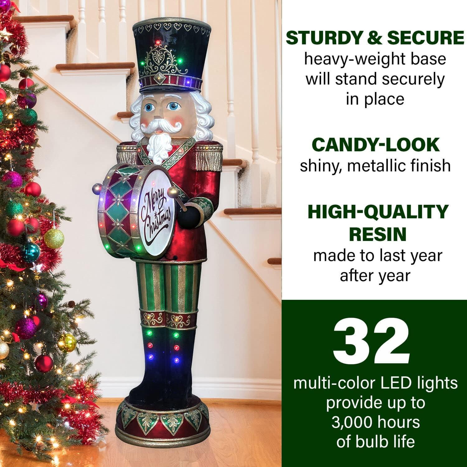 Fraser Hill Farm FFRS072-NC5-RD Indoor/Outdoor 6-Ft. Nutcracker Playing Bass Drum with Moving Hands, Music, Timer, and 32 LED Lights Holiday Decoration, Color 4